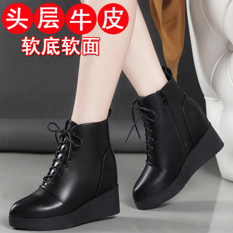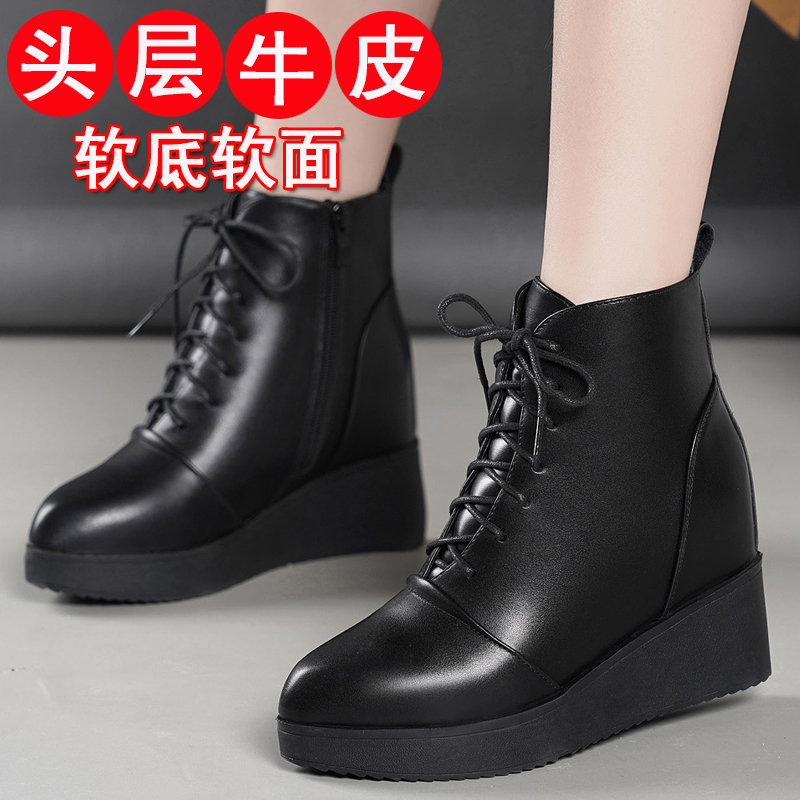 坡跟短靴女春秋冬季内增高2025年新款妈妈真皮鞋厚底高跟加绒单靴