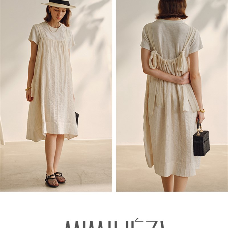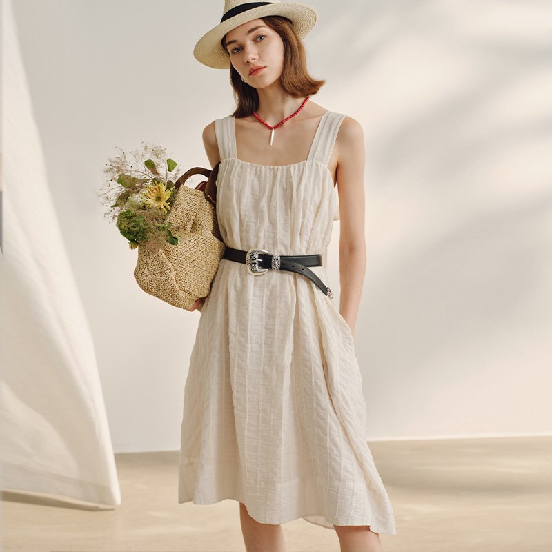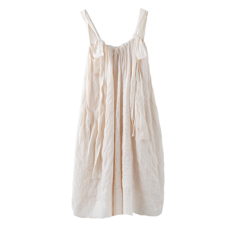 秘密盒子午后甜梦 100棉条纹绣花精致轻法式奶油杏背心吊带连衣裙