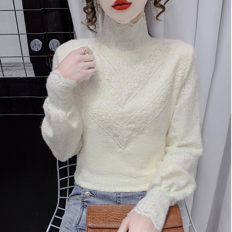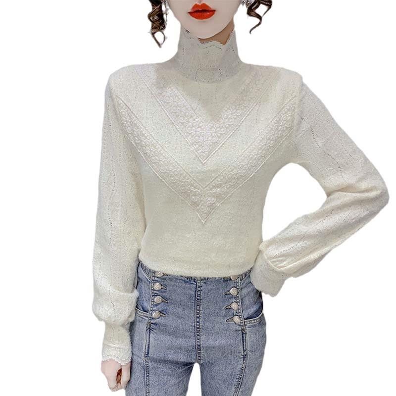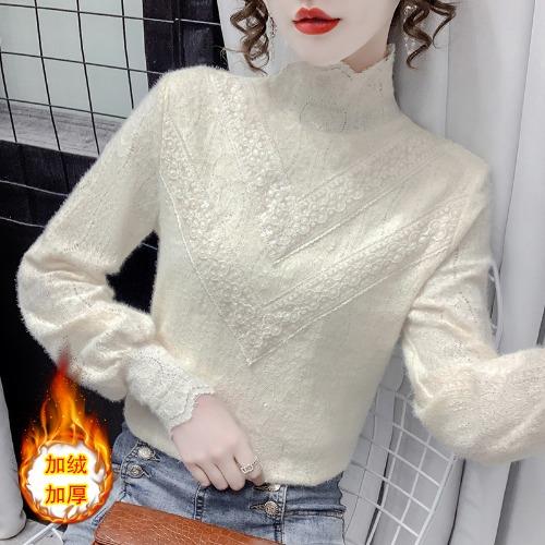 半高领加绒加厚蕾丝打底衫女秋冬洋气内搭小衫百搭V领上衣1025z