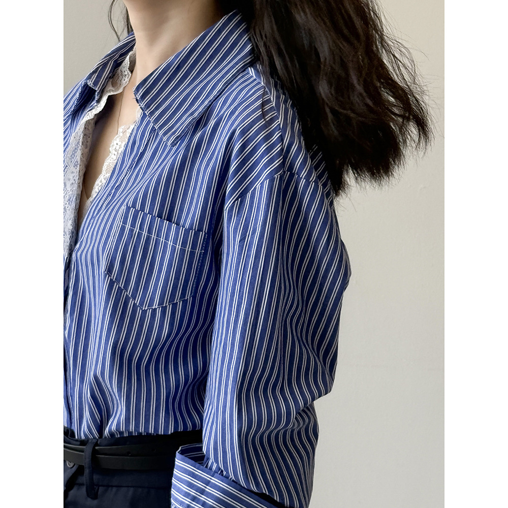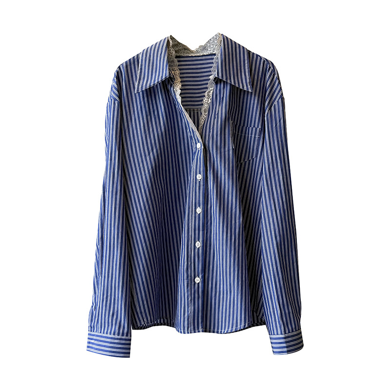 好货 法式蕾丝拼接条纹衬衫女 秋季韩系气质通勤长袖上衣82566
