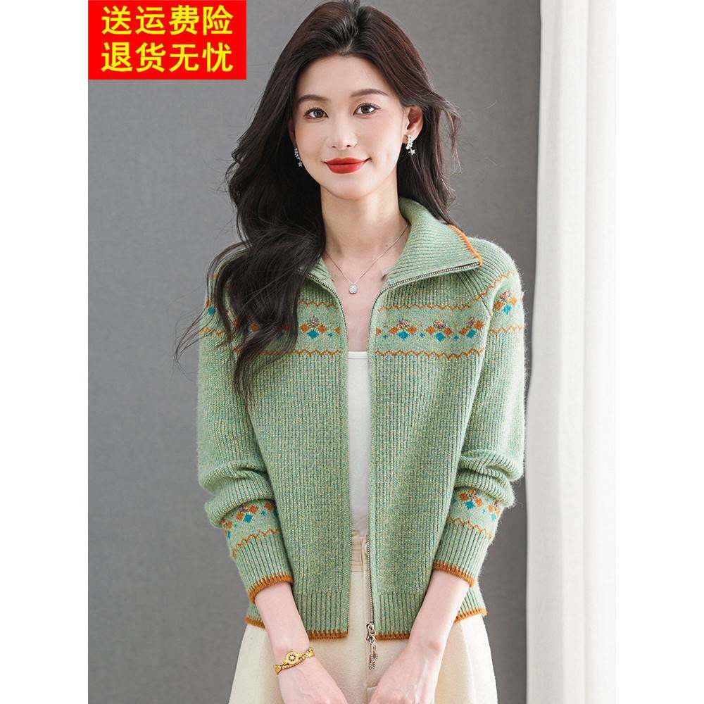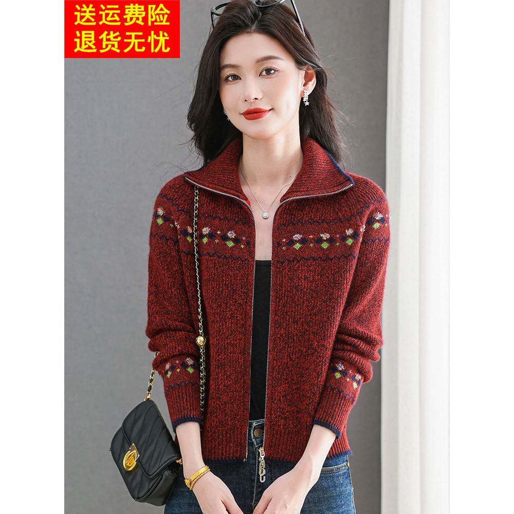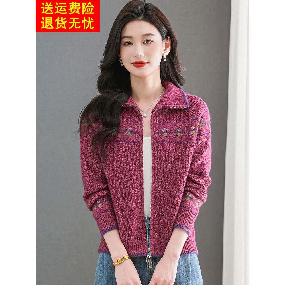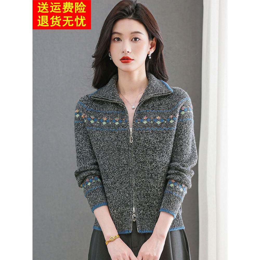 鄂尔多斯市翻领羊毛针织开衫女新款春秋提花拉炼羊绒毛衣外搭外套