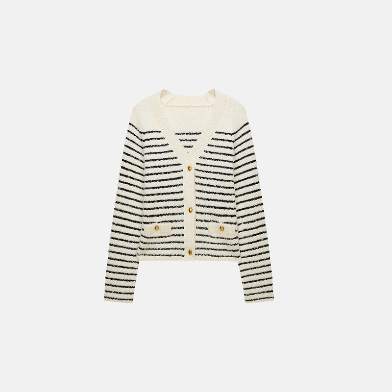 OCHIRLY欧时力 小香风圈圈纱条纹针织外套女V领开衫2025秋季新品