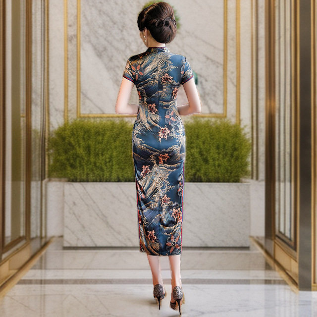 贵夫人海浪花桑蚕丝长款旗袍日常穿搭修身显示贵气妈妈中式礼服潮