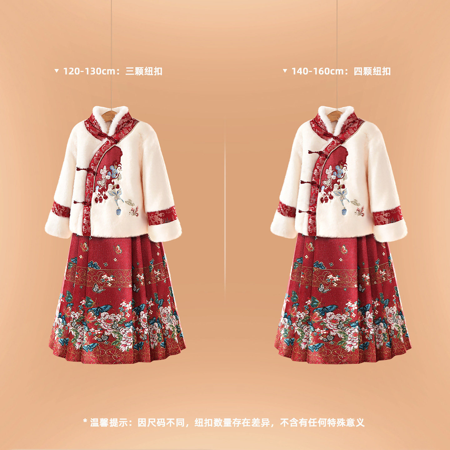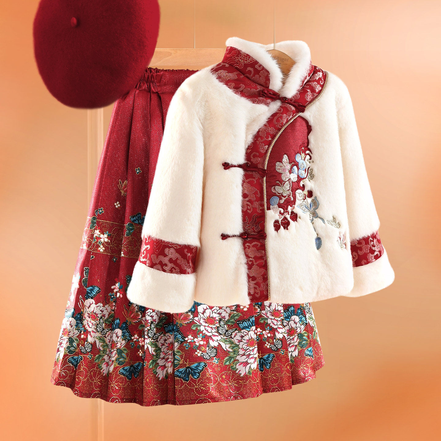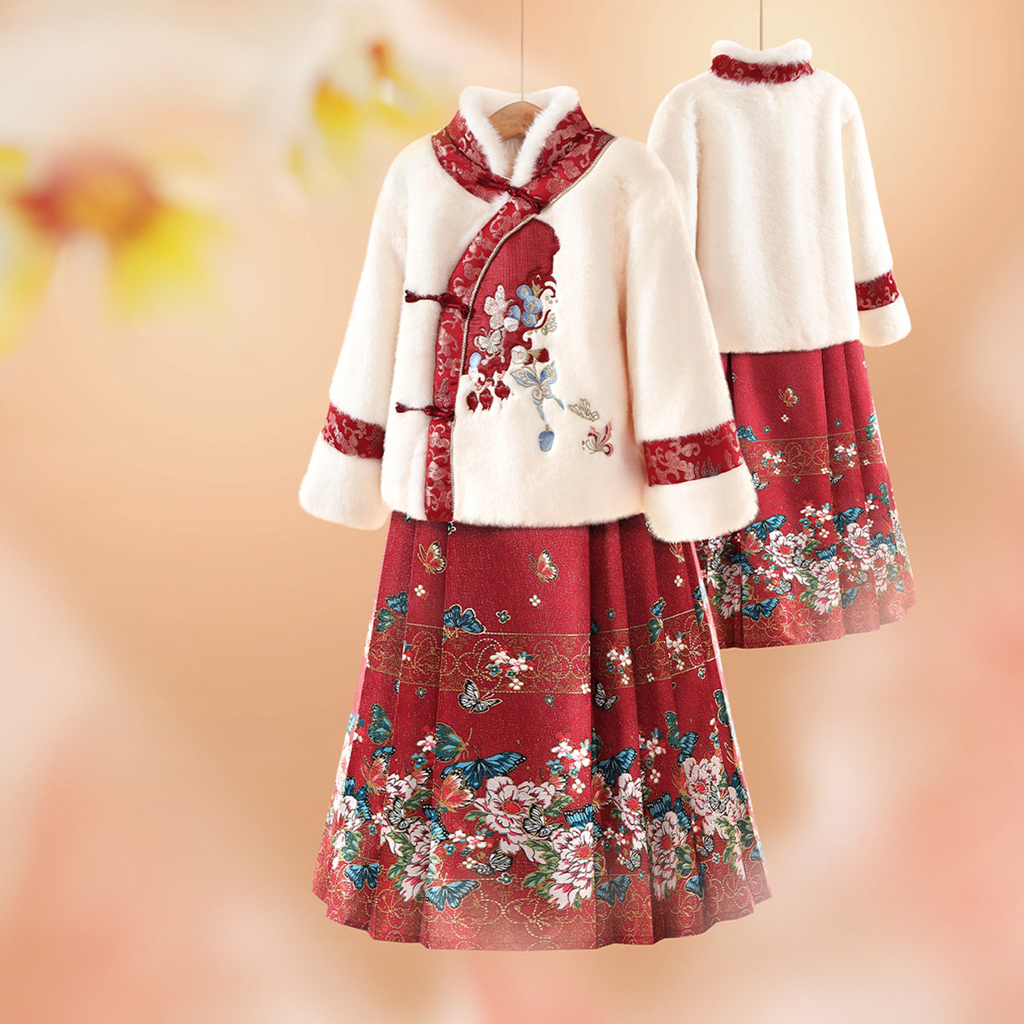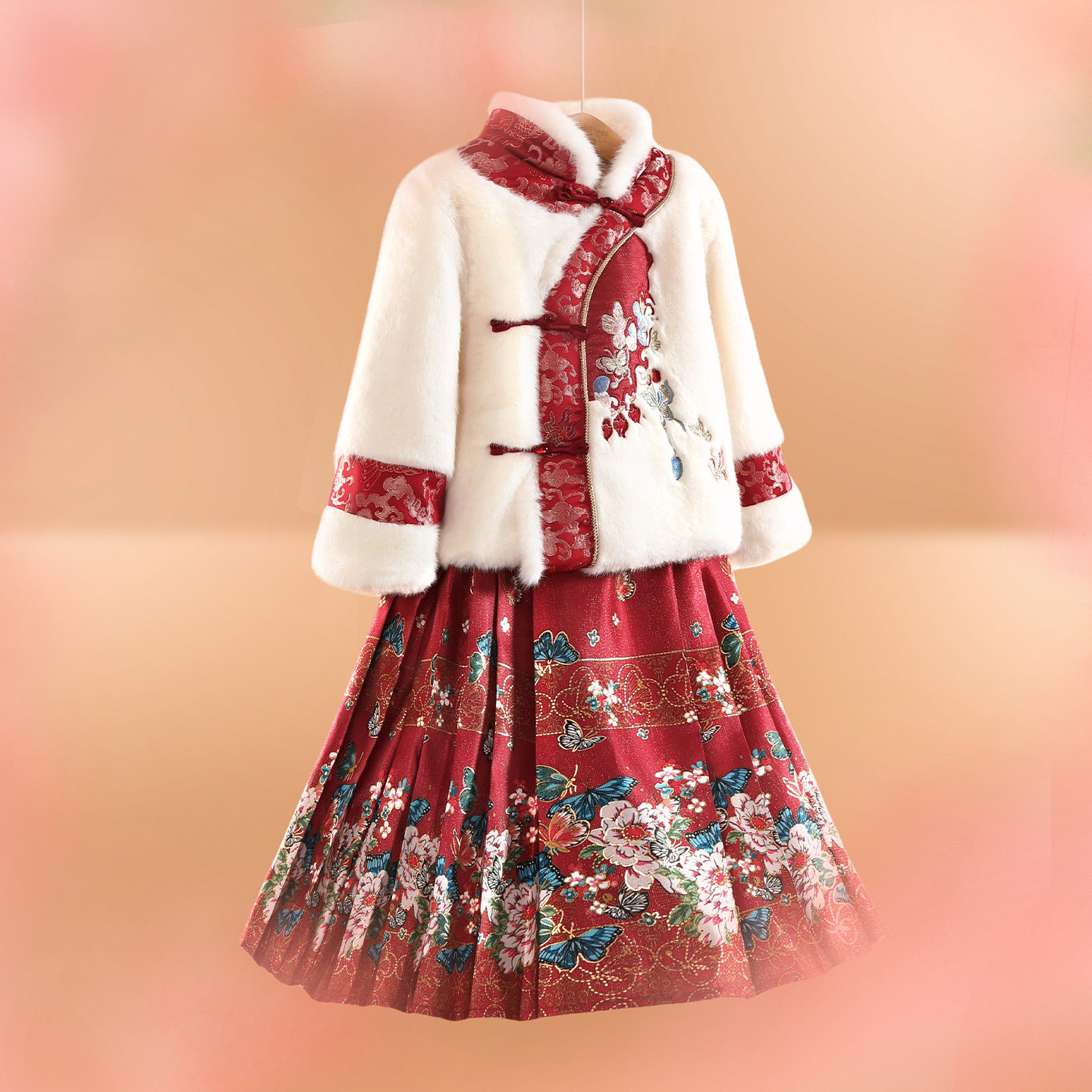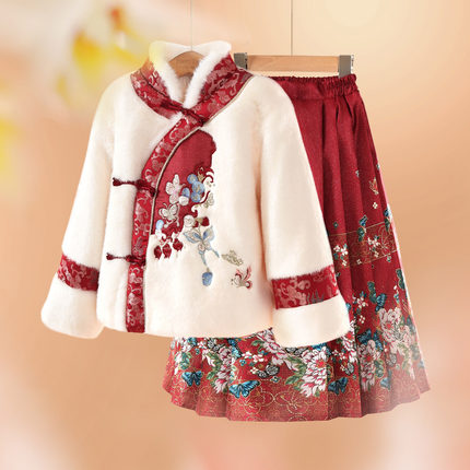 小虎帕蒂冬新款女童立领刺绣中式上衣蝴蝶马面裙汉服套装加厚保暖