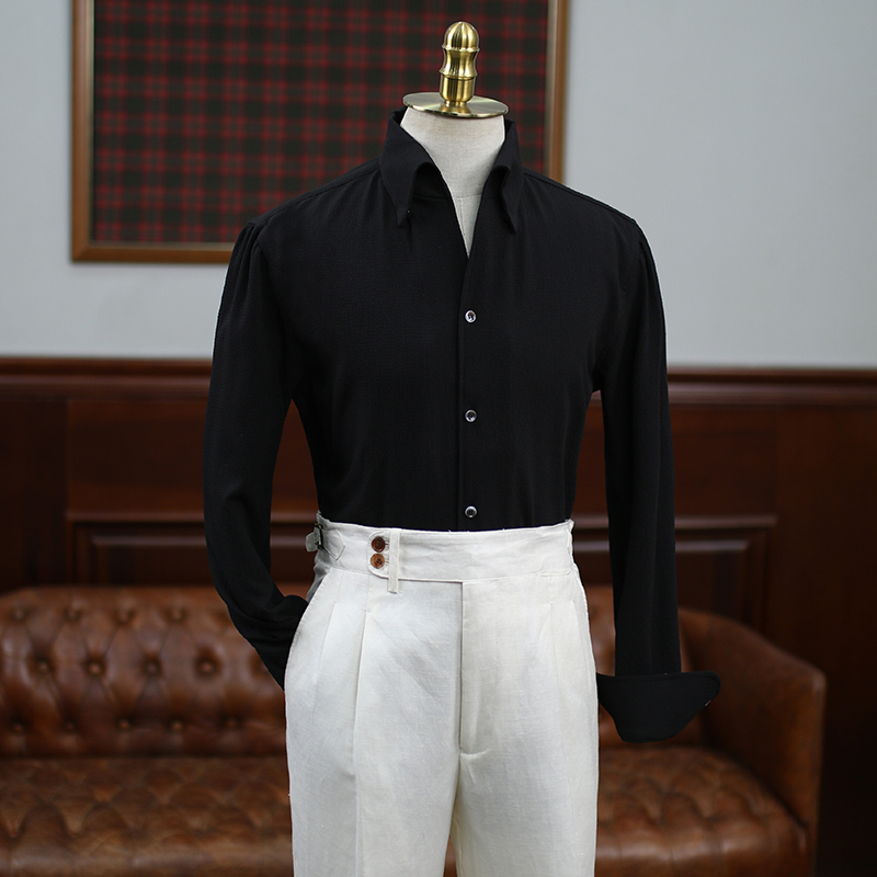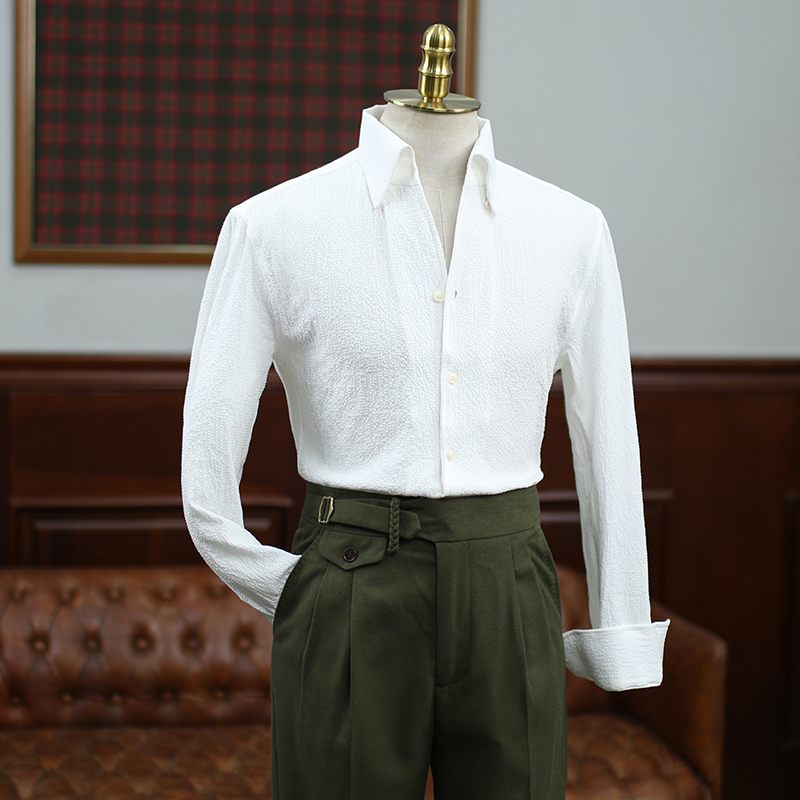 复古长袖衬衫泡泡纱修身一片领男