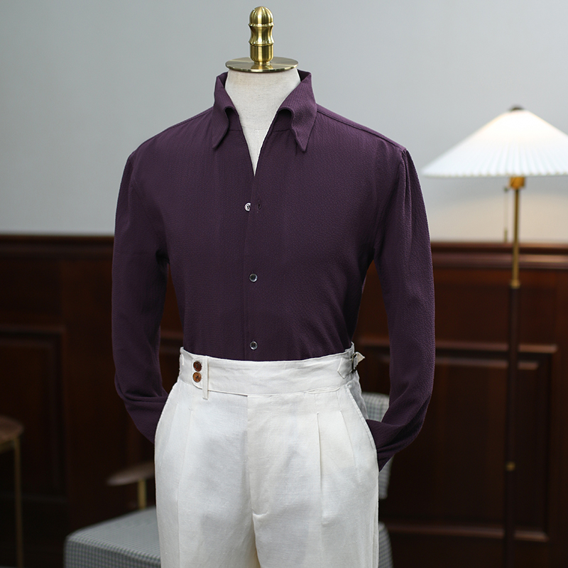 IsirHonour意式复古一片领泡泡纱紫色时尚修身长袖衬衫休闲衬衣男