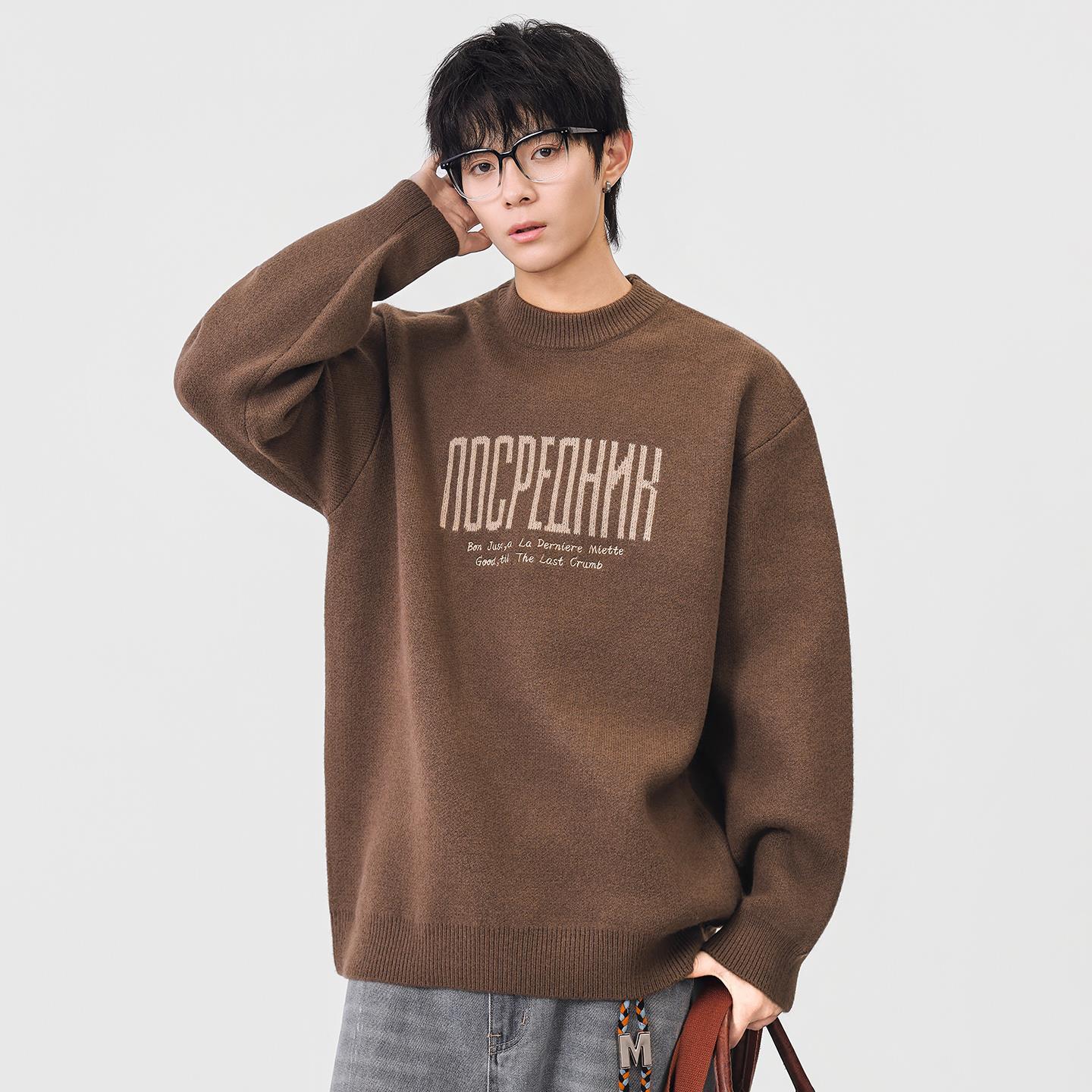 以纯圆领套头提花毛衣男士日系潮流休闲百搭针织衫秋冬季宽松