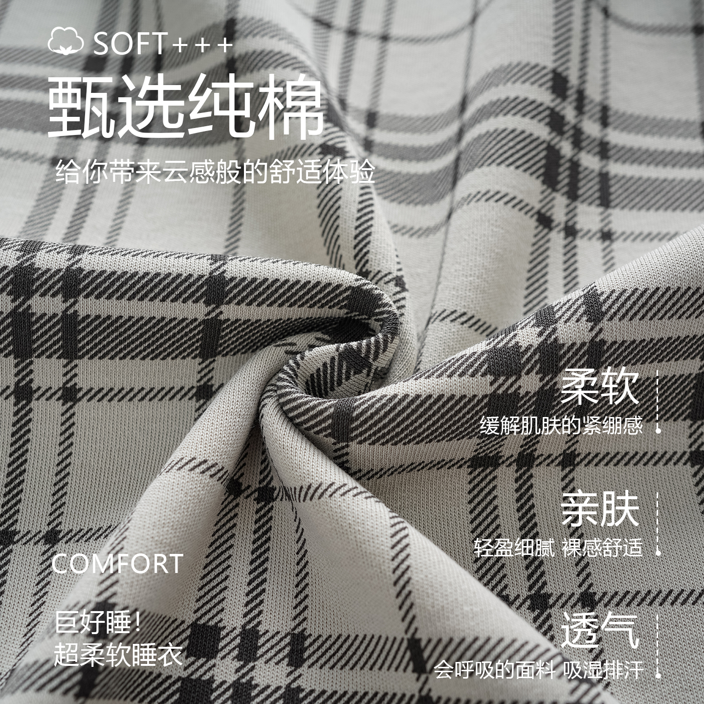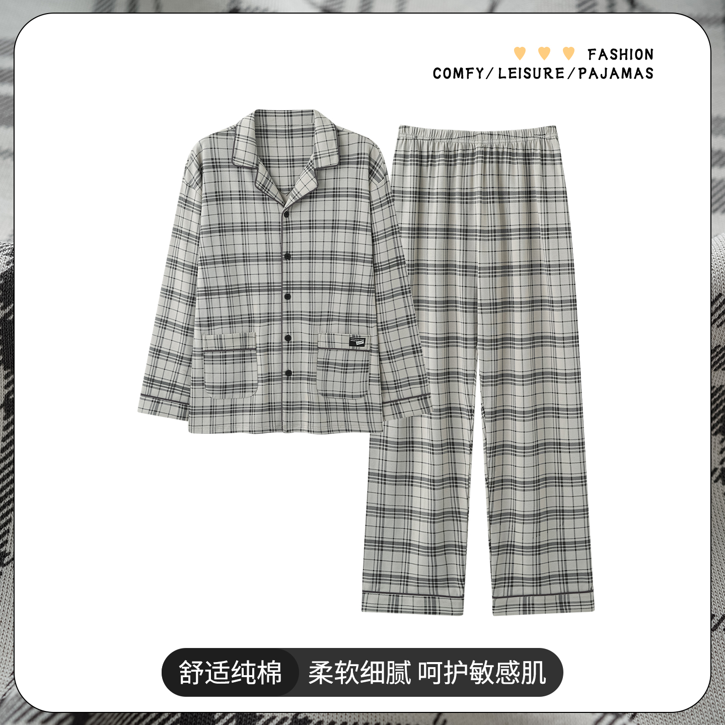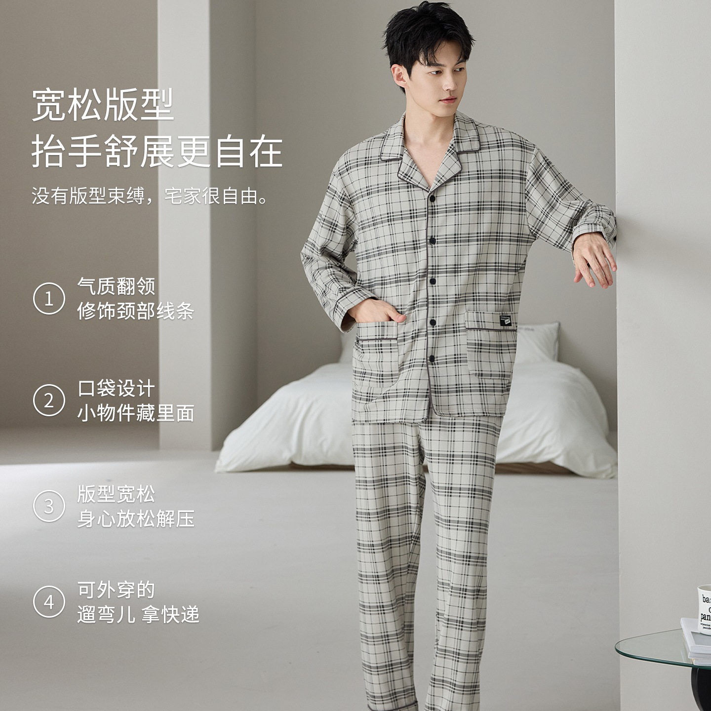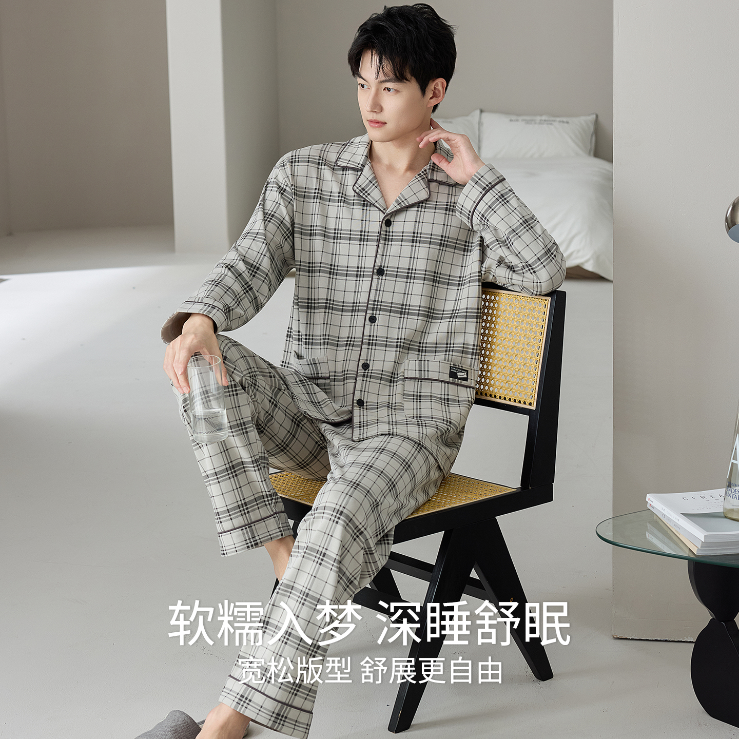 浪莎睡衣男春秋款纯棉开衫长袖长裤宽松可外穿男生家居服格子套装