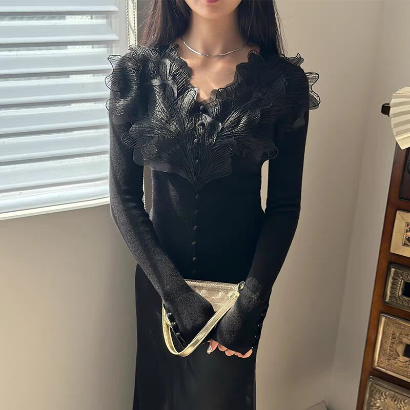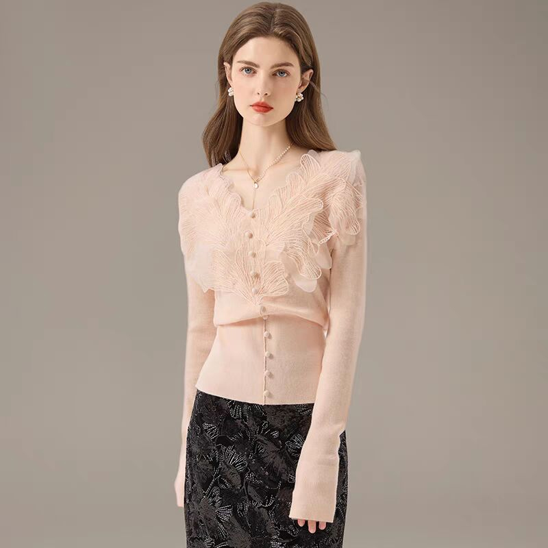 法式气质v领蕾丝长袖针织衫上衣女秋季新款小众修身显瘦百搭毛衣
