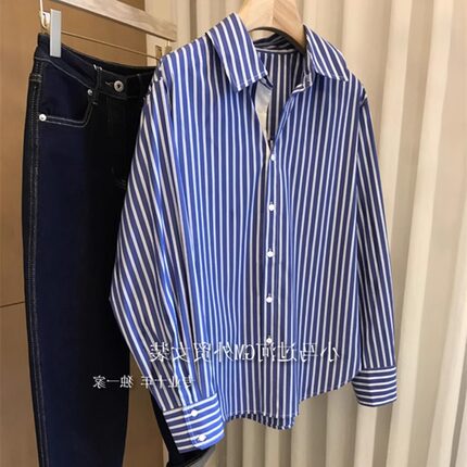 小众慵懒感韩范外搭蓝色条纹衬衫女2026春季新款撞色设计长袖衬衣