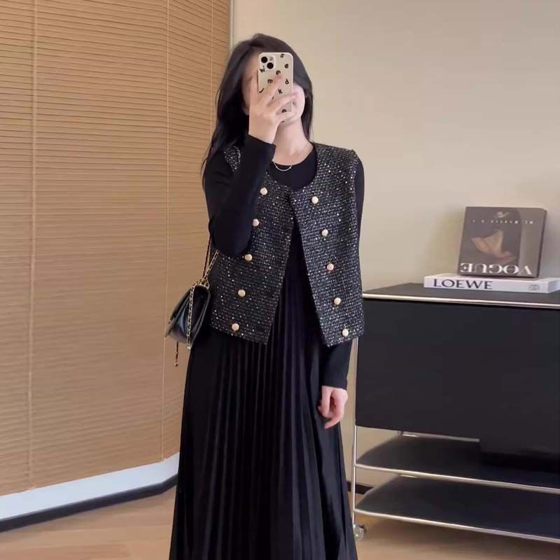 黑色连衣裙套装女春秋2025新款名媛气质小香风马甲显瘦长裙两件套