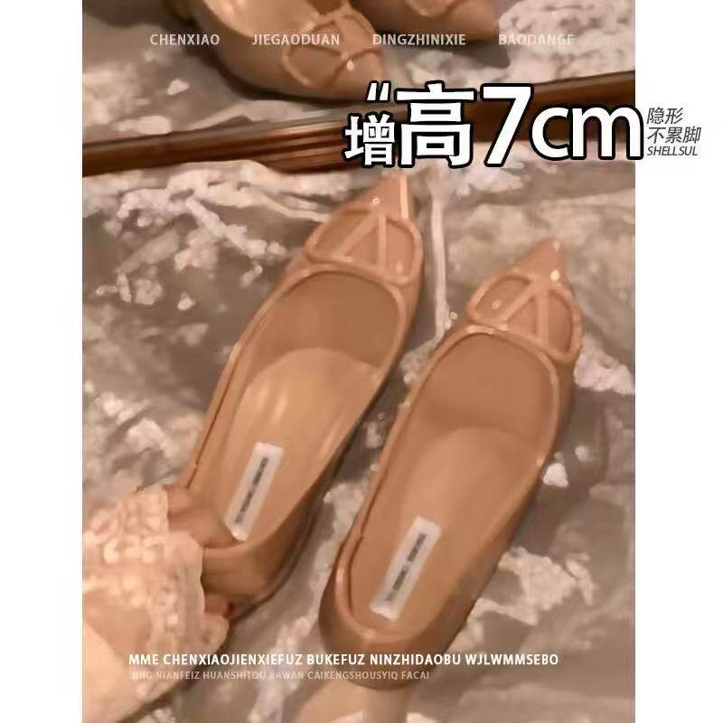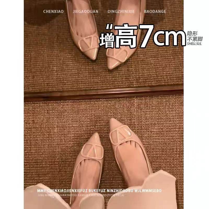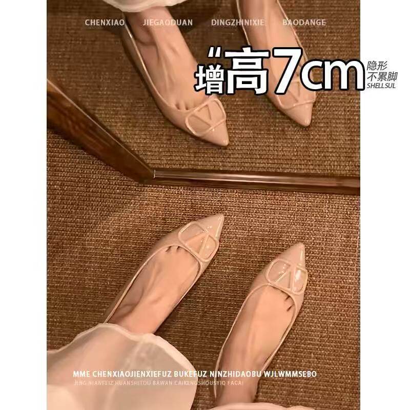 气质尖头单鞋女2025新款裸色金属V扣名媛风浅口小个子内增高女鞋