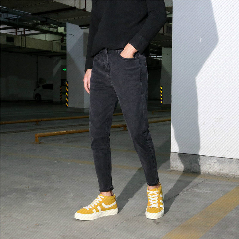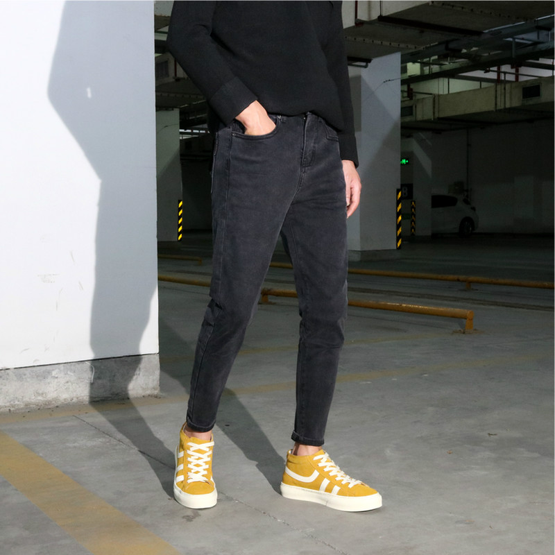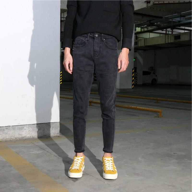 黑灰色九分牛仔裤男士新款修身小脚铅笔裤百搭弹力休闲微跨锥形裤