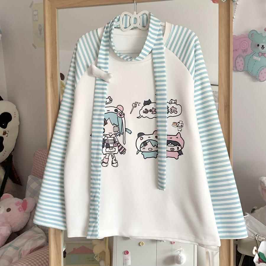原创日系甜美可爱圆领加绒卫衣女宅萌系加厚条纹纯棉外套长袖上衣