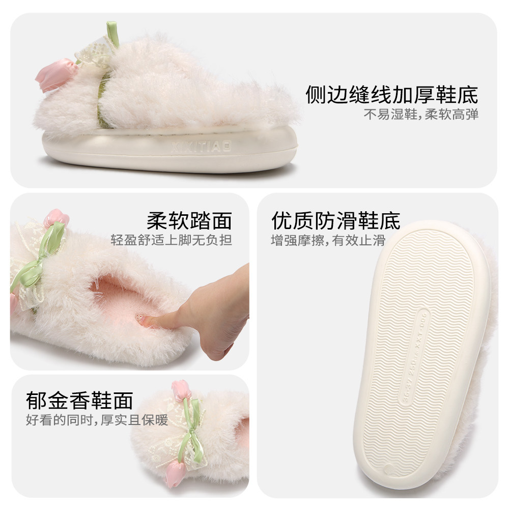 细细条 法式郁金香蕾丝毛毛鞋女舒适保暖冬季ins仙女风居家棉拖鞋
