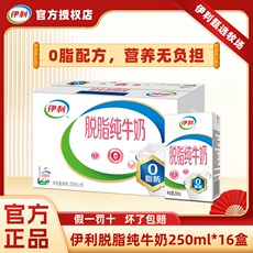 2月伊利脱脂纯牛奶250*16/24盒整箱营养早餐0脂肪纯奶官方正品H