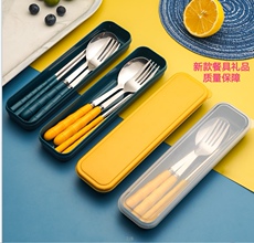 木柄西餐具不锈钢叉勺筷三件套便携盒成人学生旅行餐具套装包邮