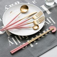 北欧小蛮腰磨砂玫瑰金304不锈钢牛排刀叉勺筷四件套西餐餐具套装