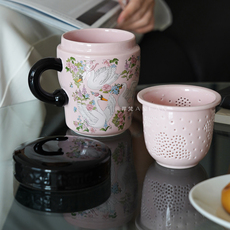 岸梵法式创意天鹅陶瓷杯带盖茶格茶水分离马克杯办公室茶杯咖啡杯
