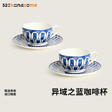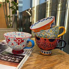 中古国风手绘青花咖啡杯碟古典下午茶拿铁杯复古拉花杯陶瓷马克杯