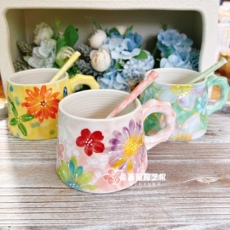F23新款濑户烧陶瓷釉下彩马克杯大肚竹杯水杯满花浮雕送勺果汁杯