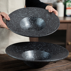 草帽碗盘子日式餐具黑色陶瓷草帽盘吉田成器西餐微瑕意面盘沙拉碗