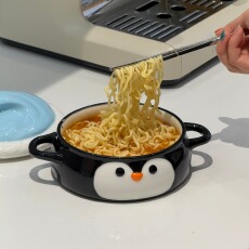 企鹅泡面碗可爱大容量双耳带盖陶瓷汤碗宿舍学生早餐碗