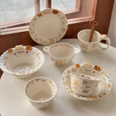 佩尔森可爱卡通碗碟套装家用陶瓷盘子碗筷勺子手柄碗一二人食餐具