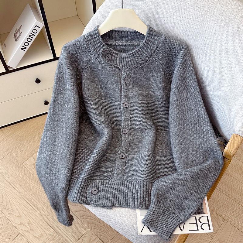 有货设计感排扣毛衫女纽扣开衫针织衫女秋冬圆领纯色毛衣外套女