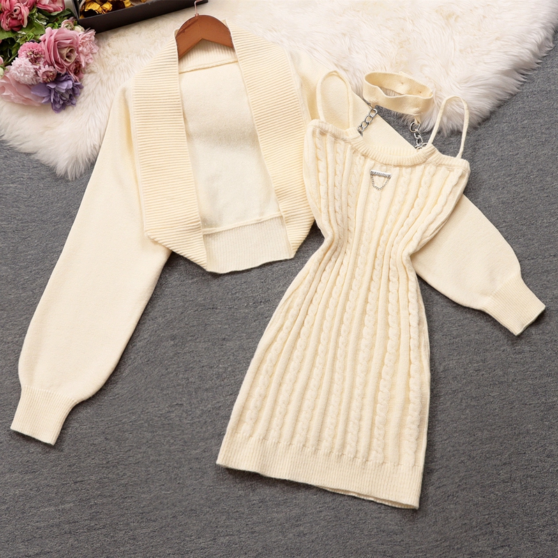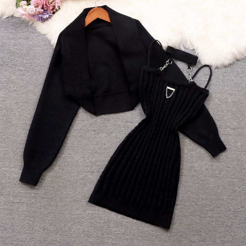 实拍网红名媛风个性披肩上衣挂脖吊带连衣裙麻花针织毛线两件套