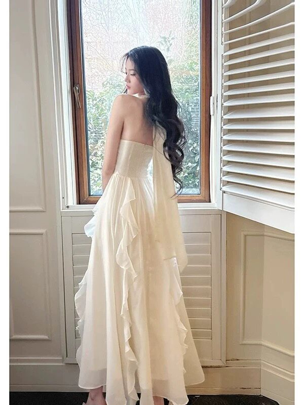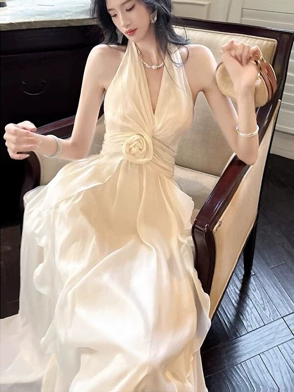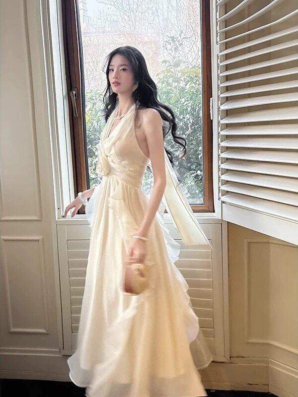【浪漫香榭】法式挂脖花朵连衣裙度假仙女裙薄纱气质长裙