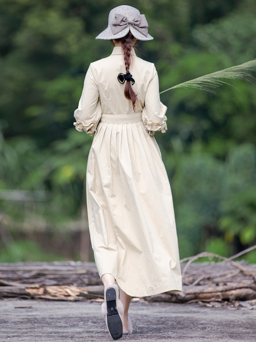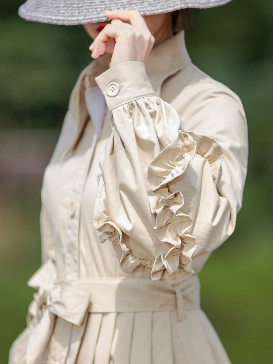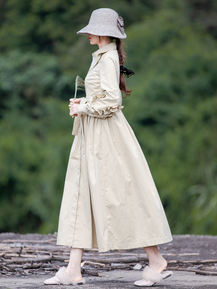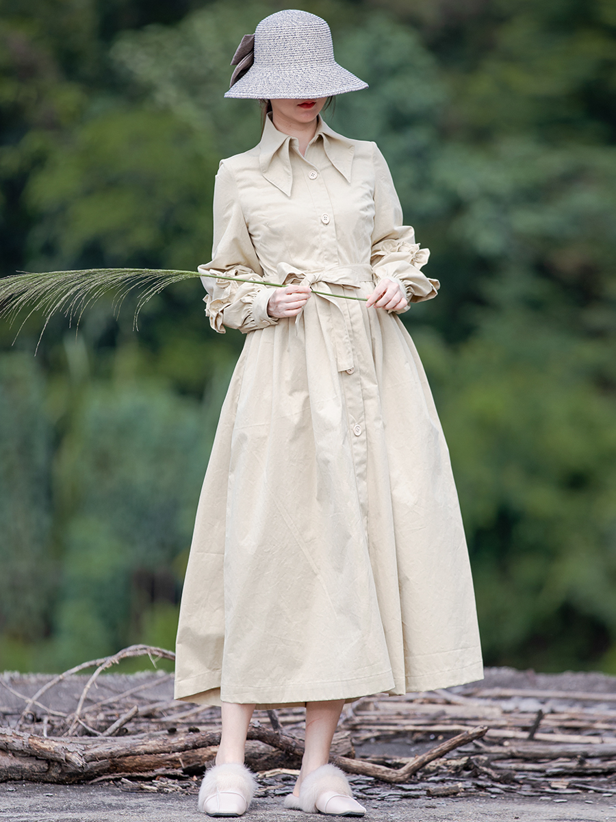 仙衣裾设计师秋冬新款连衣裙花苞袖文艺卡其色风衣女中长款外套裙