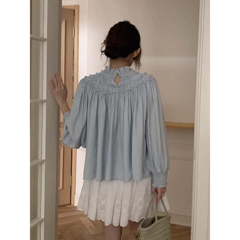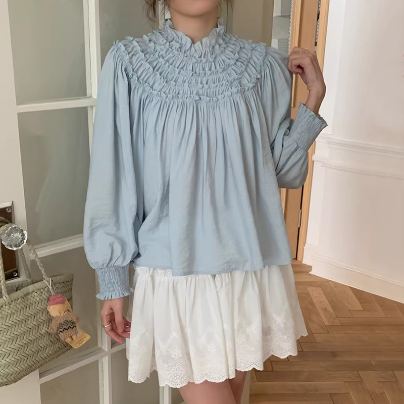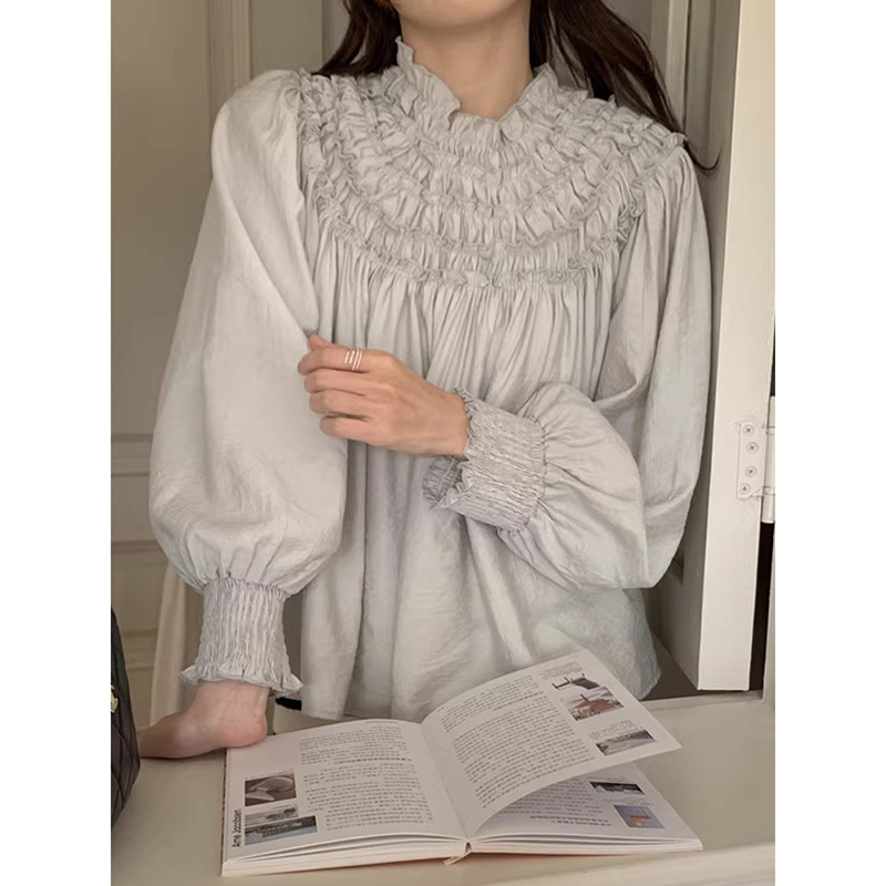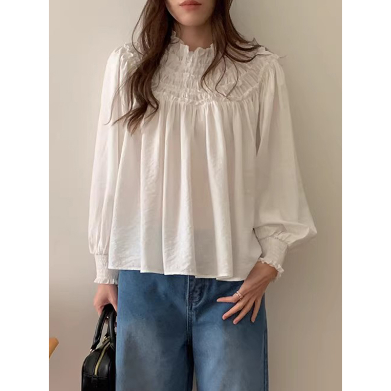 良良家木耳边工艺纯色衬衫女春季新款法式设计感褶皱宽松长袖上衣