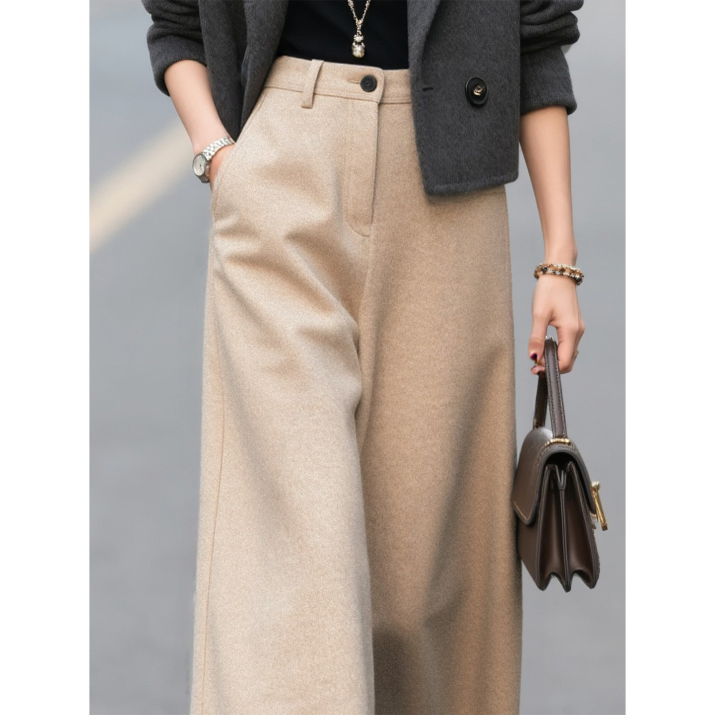 燕麦色毛呢七分阔腿裤女2026秋冬新款高级感高腰法式绝美裤子