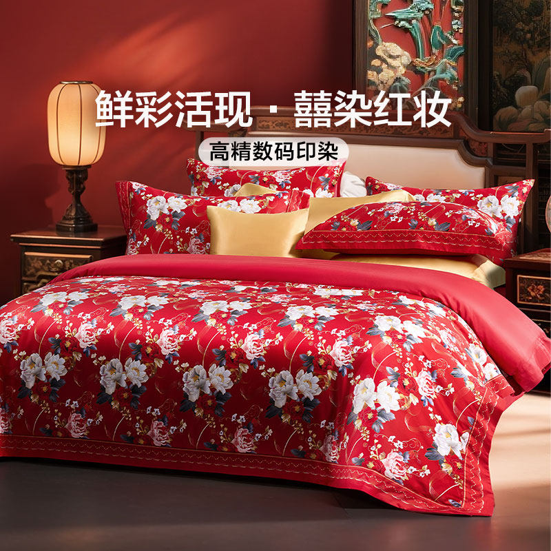 富安娜结婚四件套婚庆红色纯棉床上用品喜庆床单婚嫁喜被新婚被套