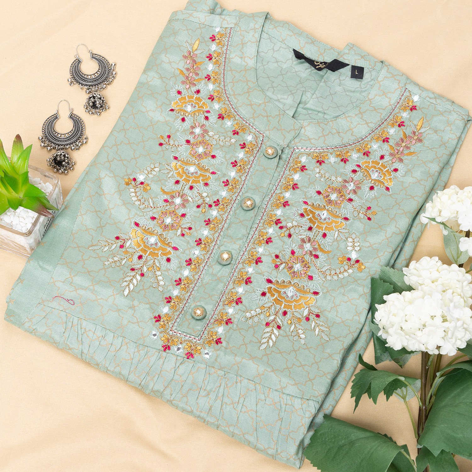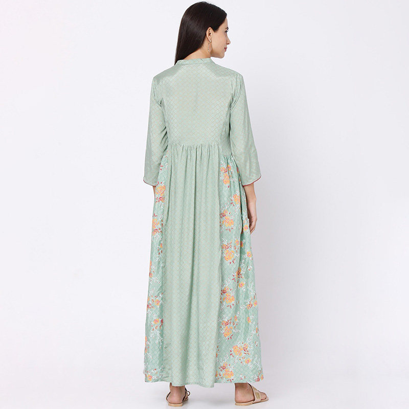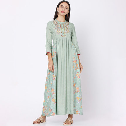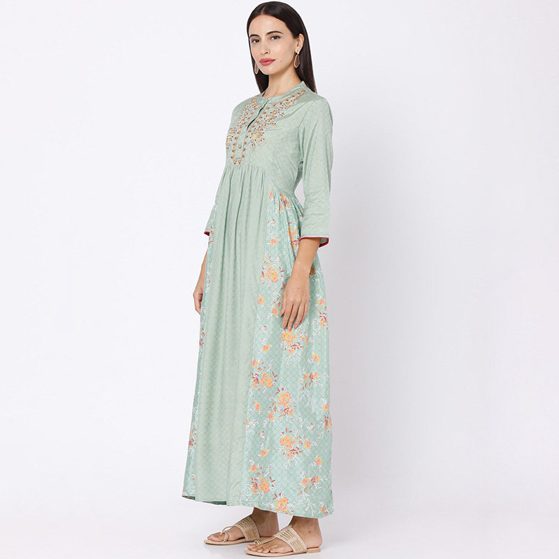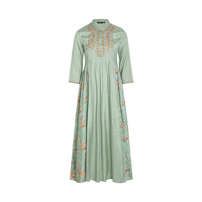 野人小饰印度女装进口刺绣印花民族风高腰连衣裙印巴风抹茶绿