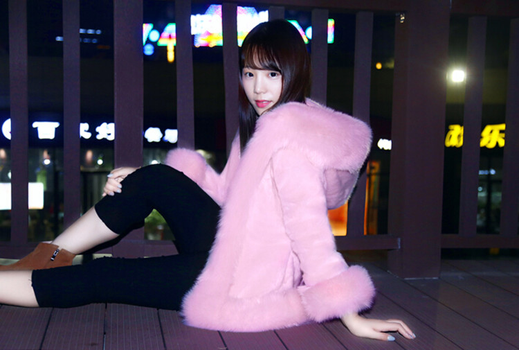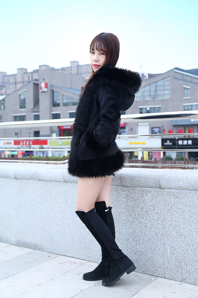 新款修身风仿兔毛连帽长袖皮草