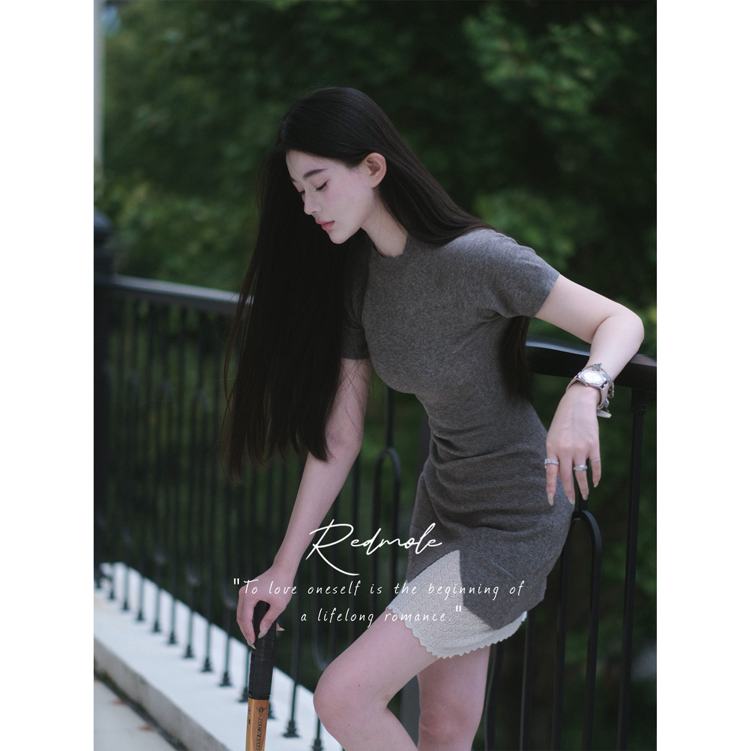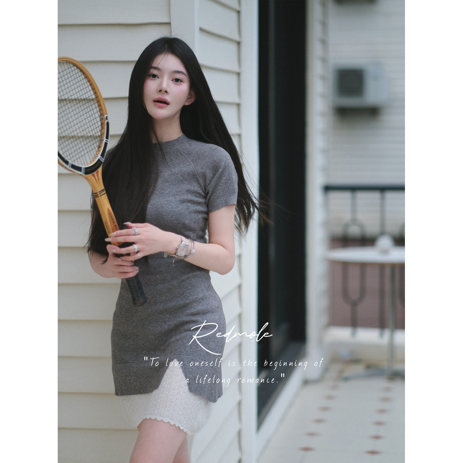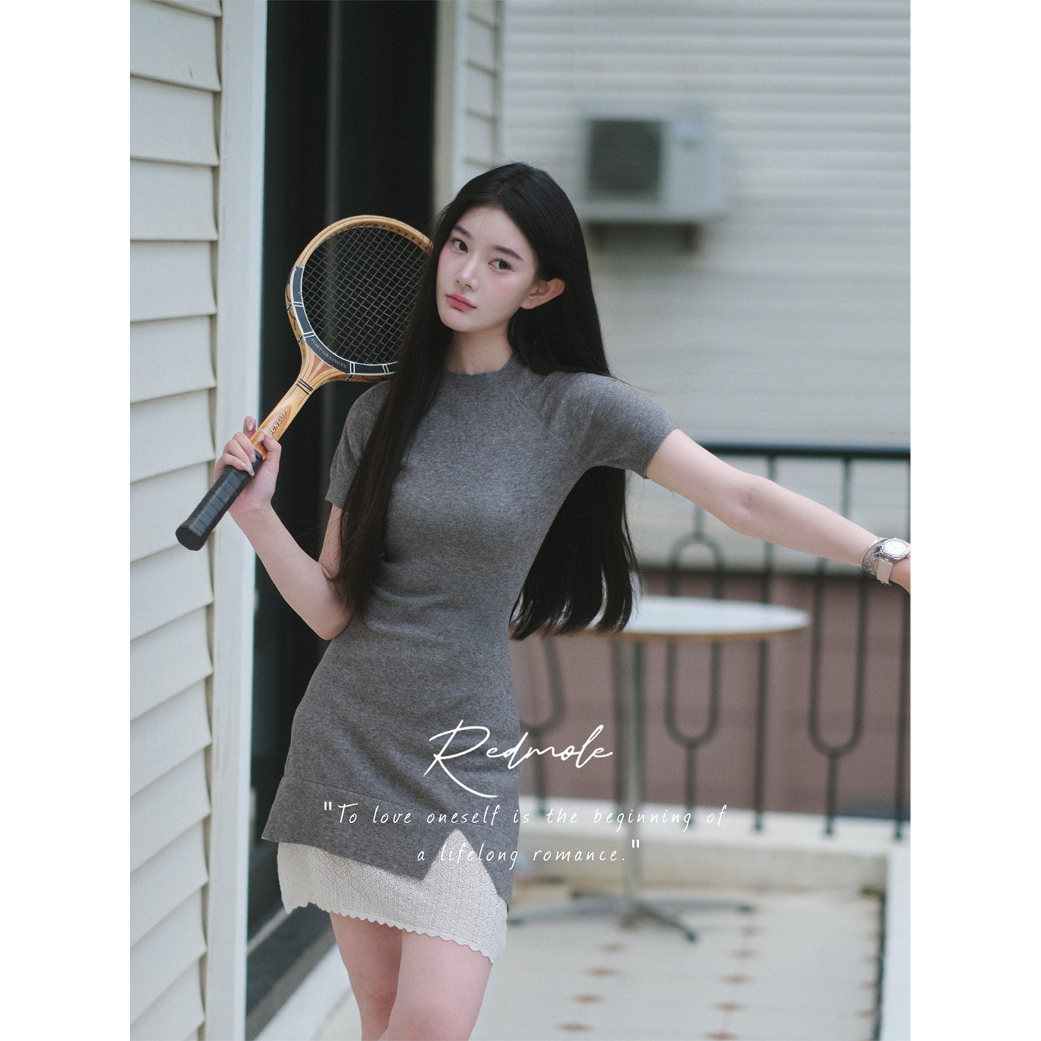 Redmole【智感灰】亲肤绒原创钩针编织蕾丝连衣裙网球少女