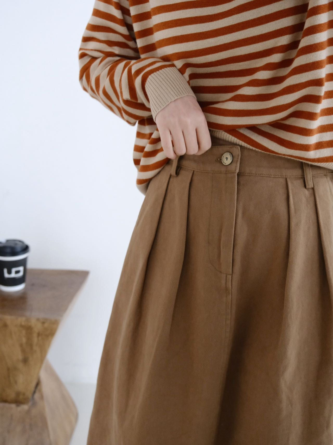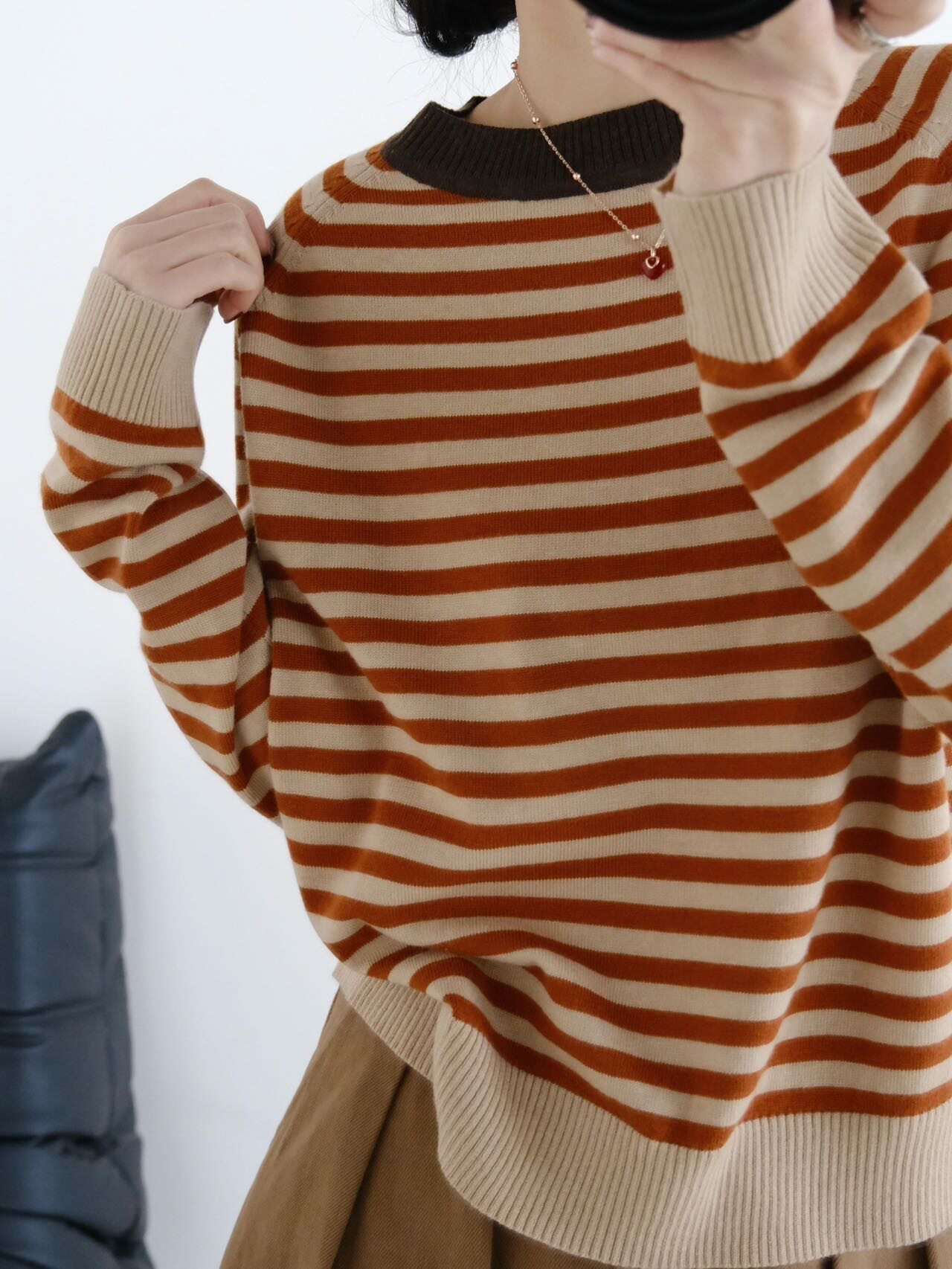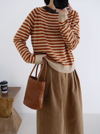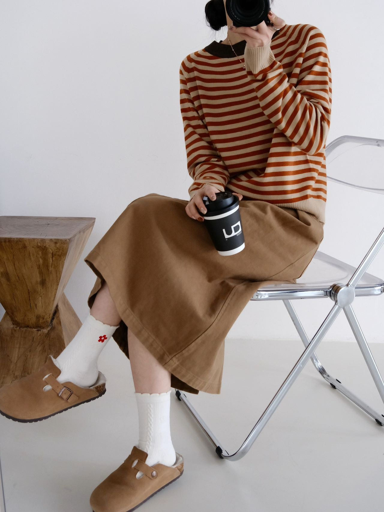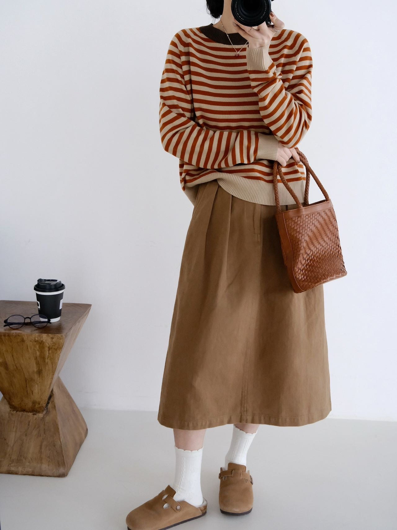 橘色羊毛条纹针织衫+100水洗棉卡其半身裙2025早秋新款套装5199