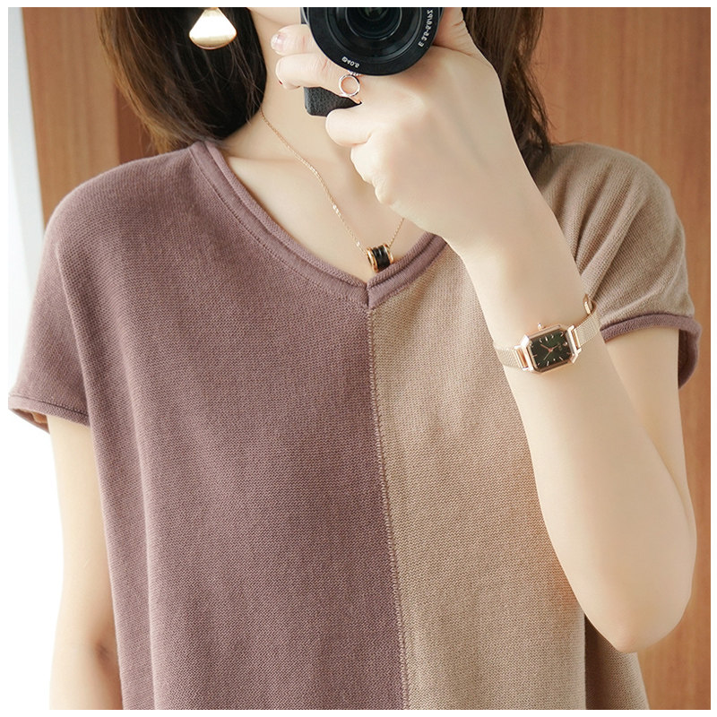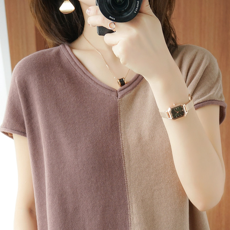 薄款针织短袖女2025春夏宽松拼色V领落肩衫纯棉麻背心棉麻内搭T恤