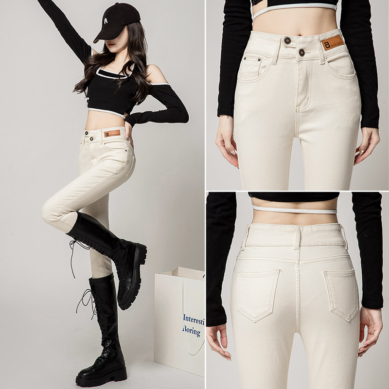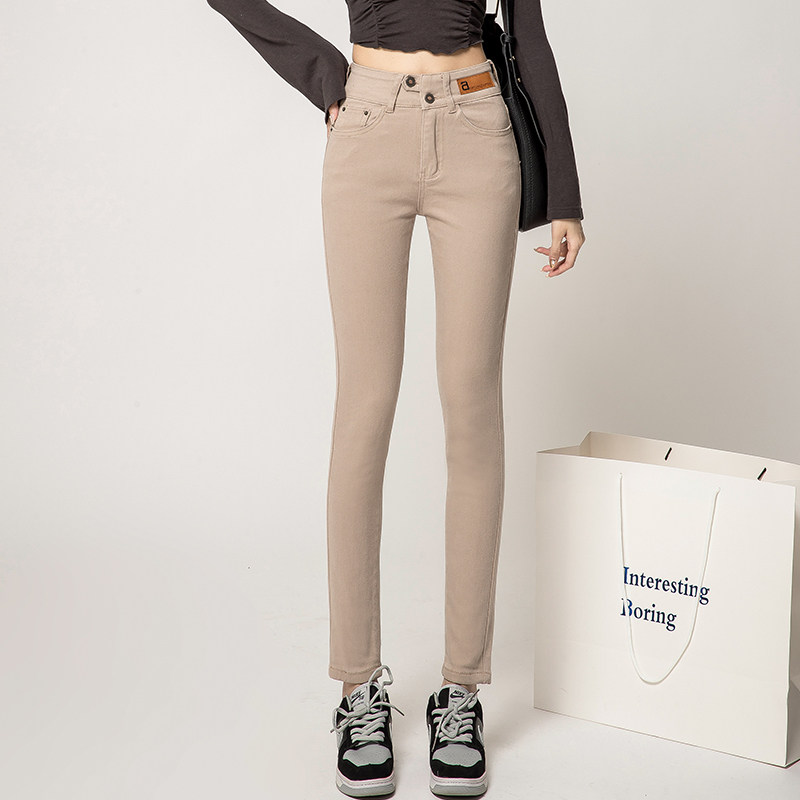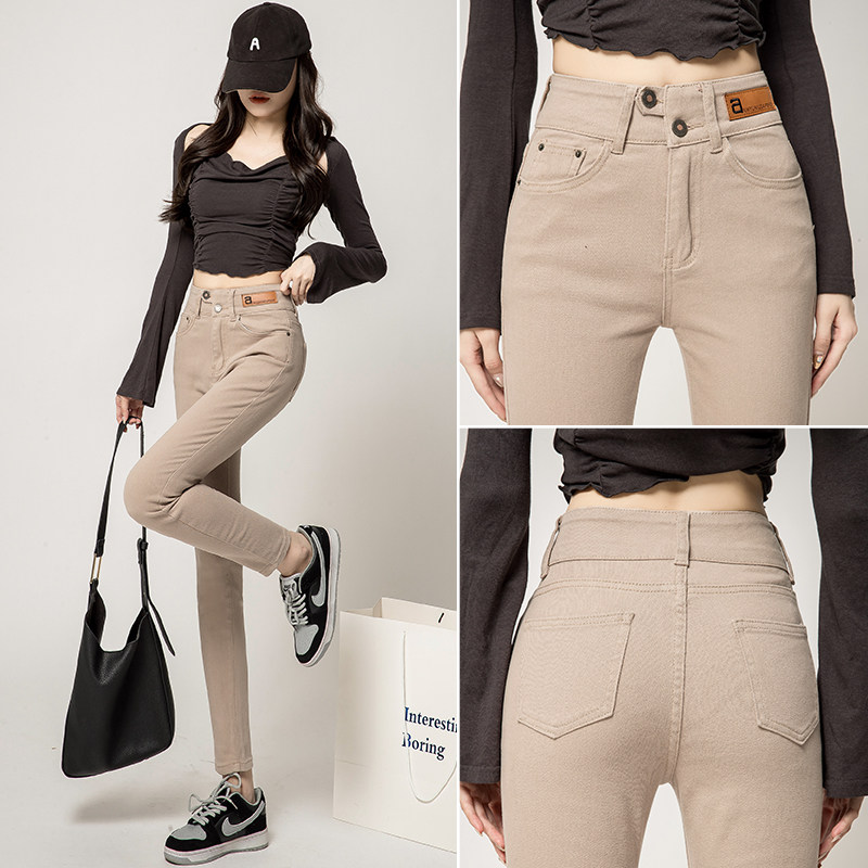 春秋新款高腰牛仔小脚裤显瘦弹力铅笔裤靴裤卡其黑色米白外穿打底