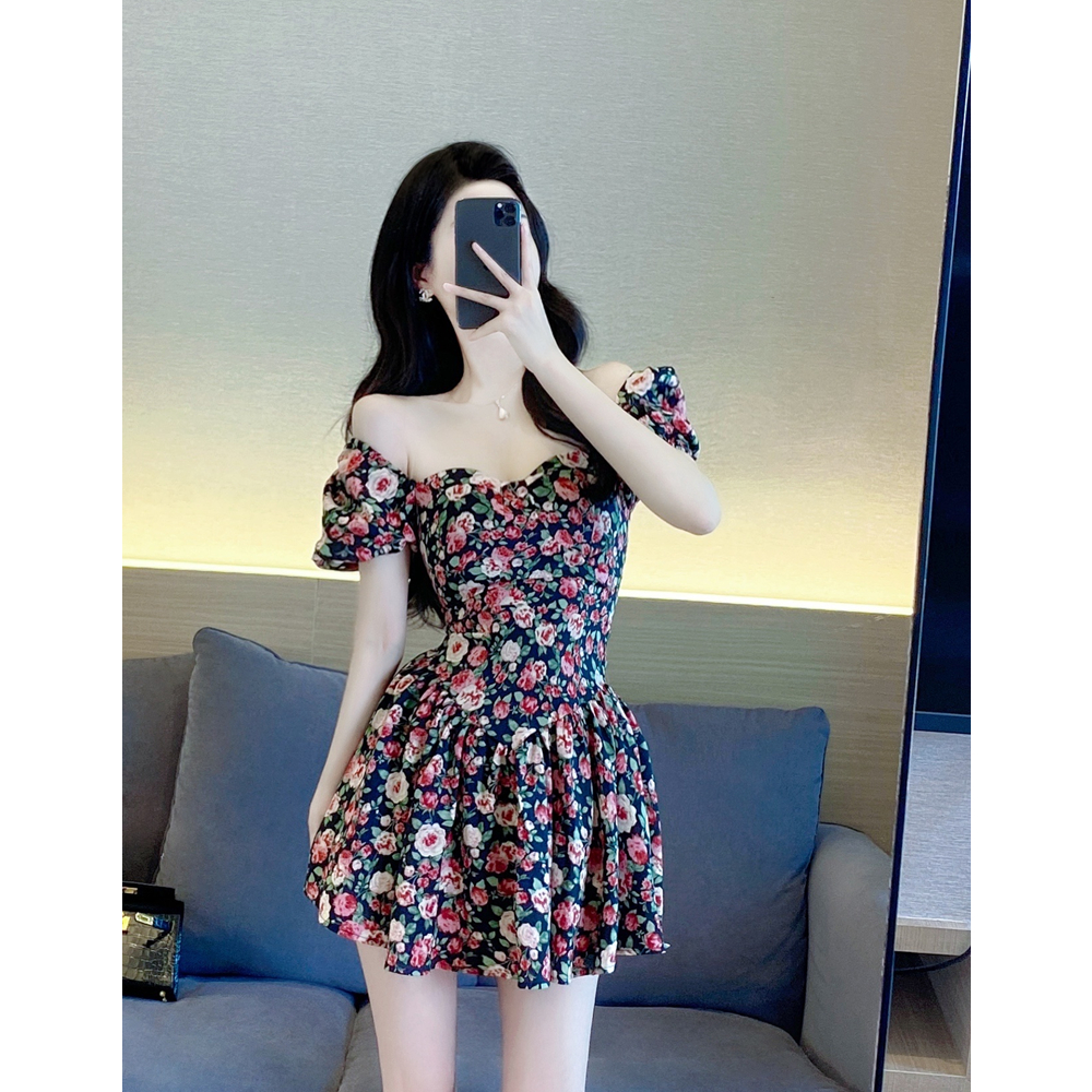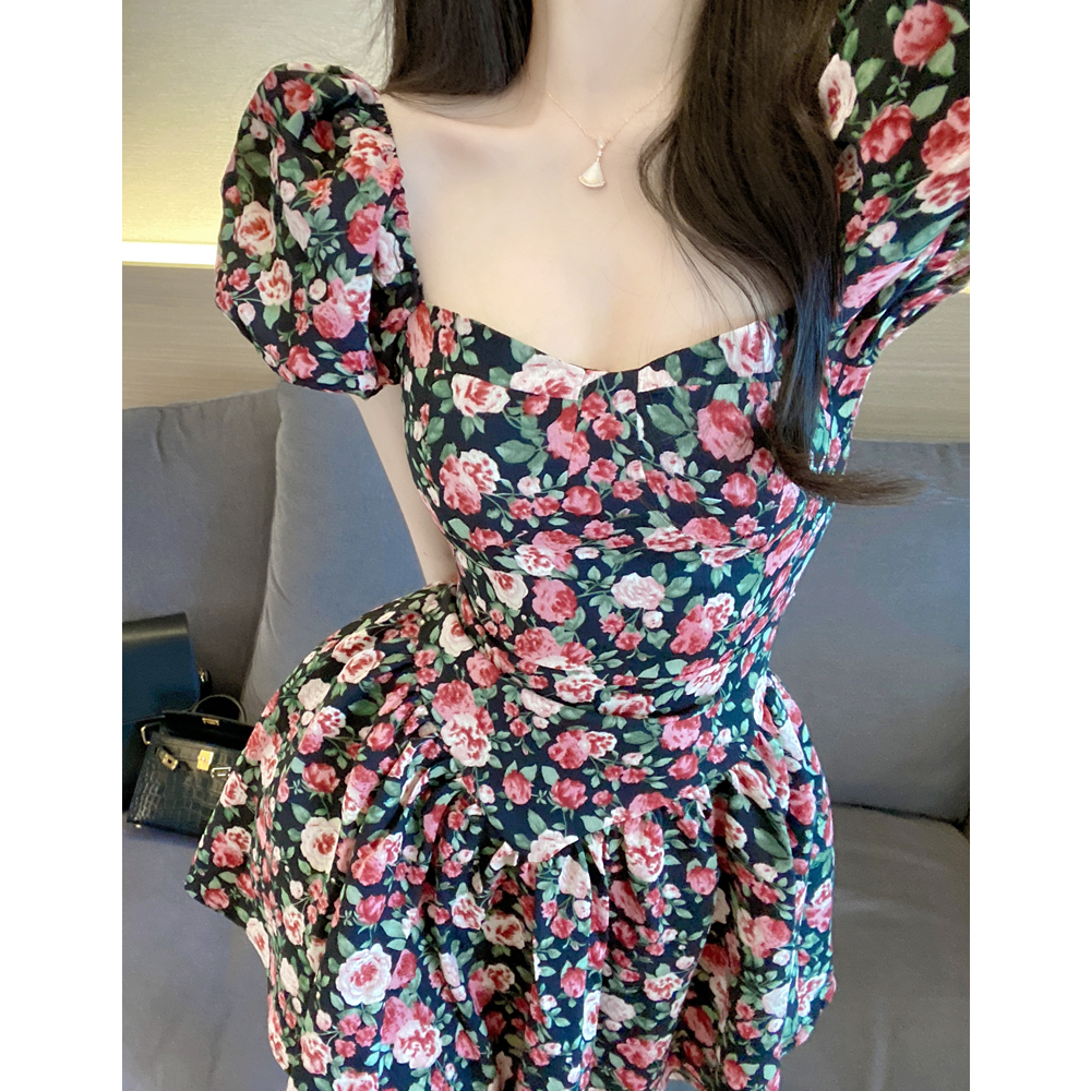碎花连衣裙女夏季2022新款法式气质甜美修身显瘦方领泡泡袖a字裙
