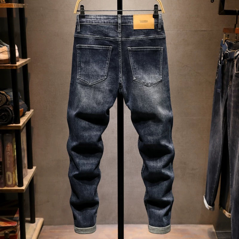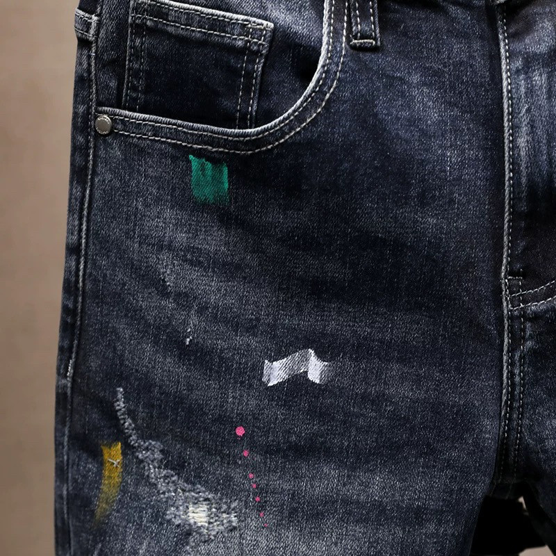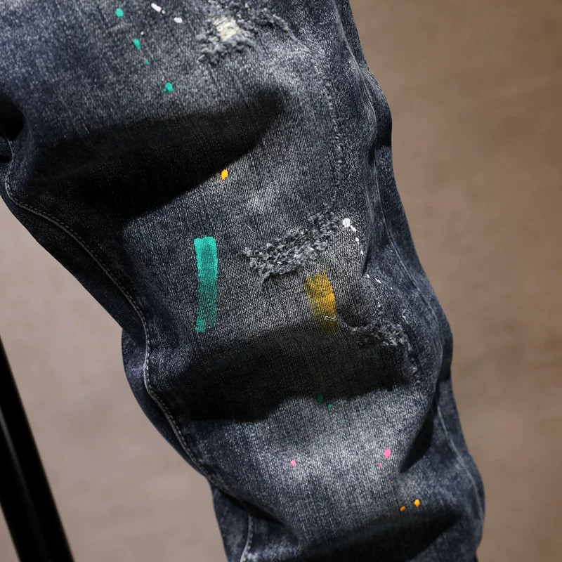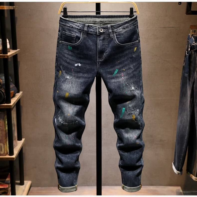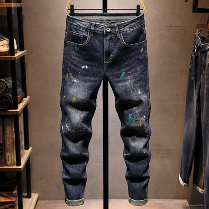 2025新款秋季高端牛仔裤男士修身小脚弹力泼墨潮牌破洞长裤子男款