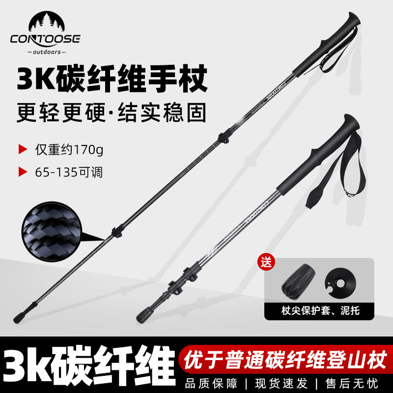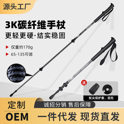 工厂户外超轻碳素专业徒步登山杖3K碳纤维三节外锁伸缩款爬山拐杖