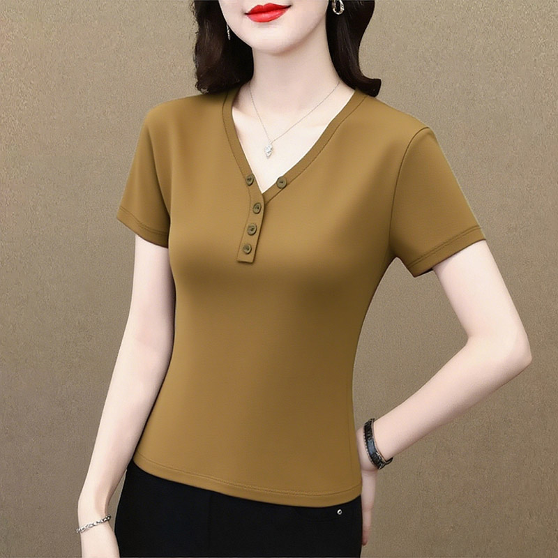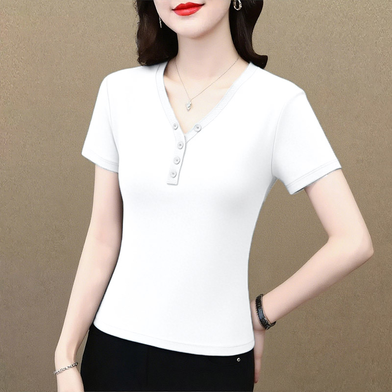 独特气质V领短袖t恤女夏季新款修身洋气减龄百搭小衫别致纽扣上衣