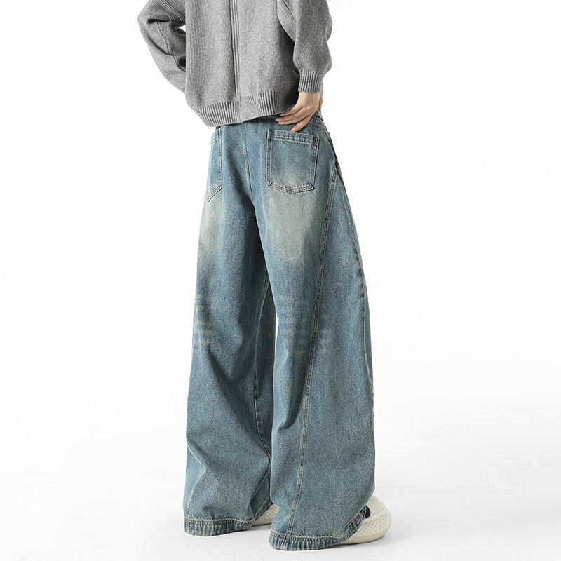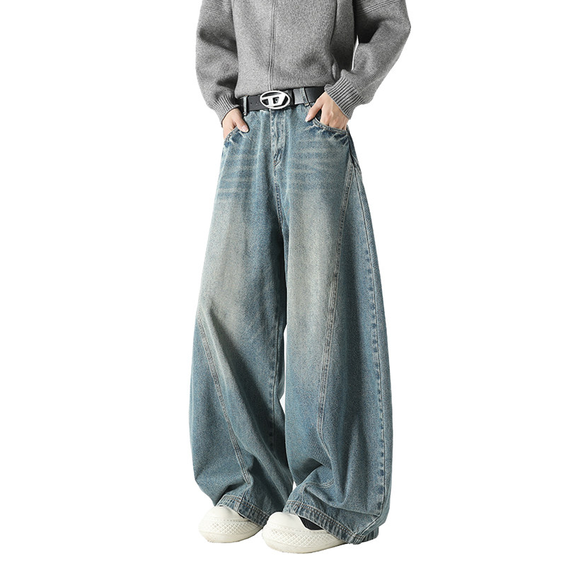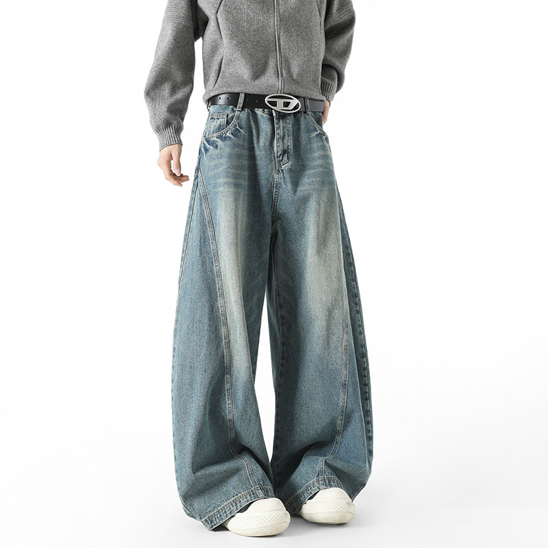 BOYUE帛跃美式街头水洗弯刀牛仔裤青少年潮牌廓形拖地阔腿长裤男
