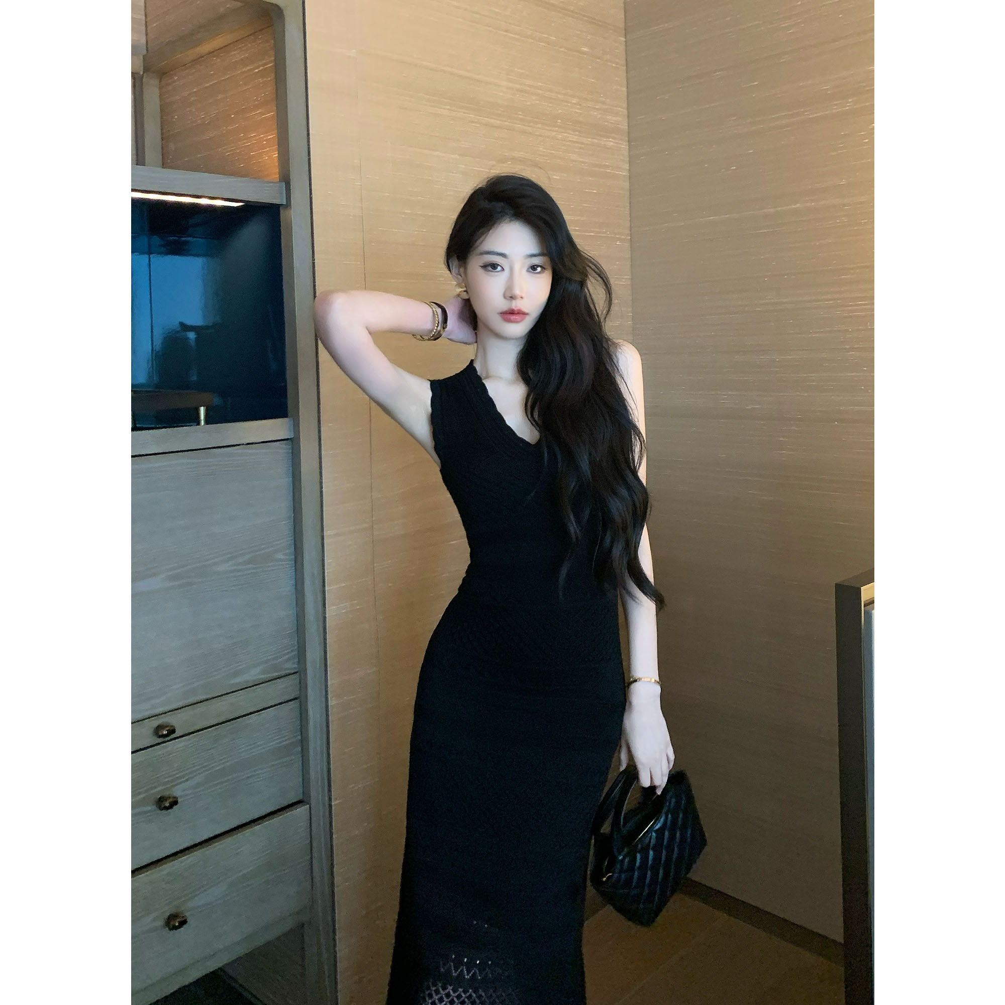 纪金其夏季显瘦时尚v领无袖挂脖连衣裙露肩褶皱包臀长裙百搭裙子