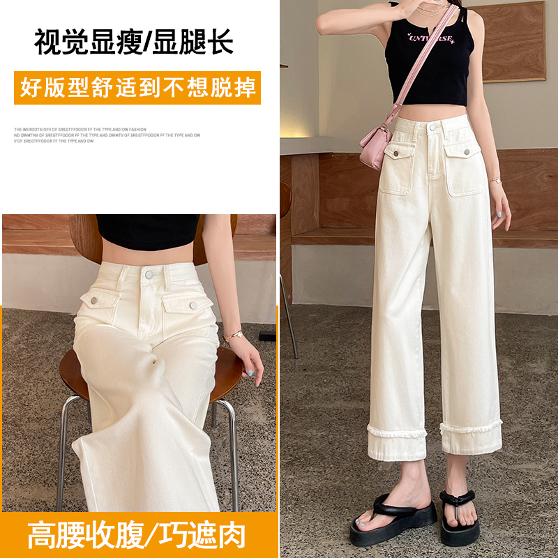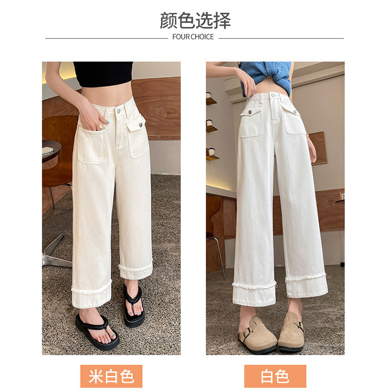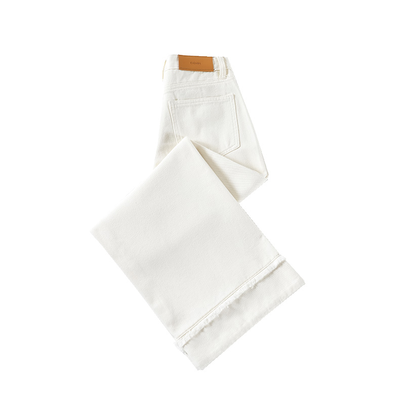 白色拼接毛边阔腿牛仔裤女直筒裤