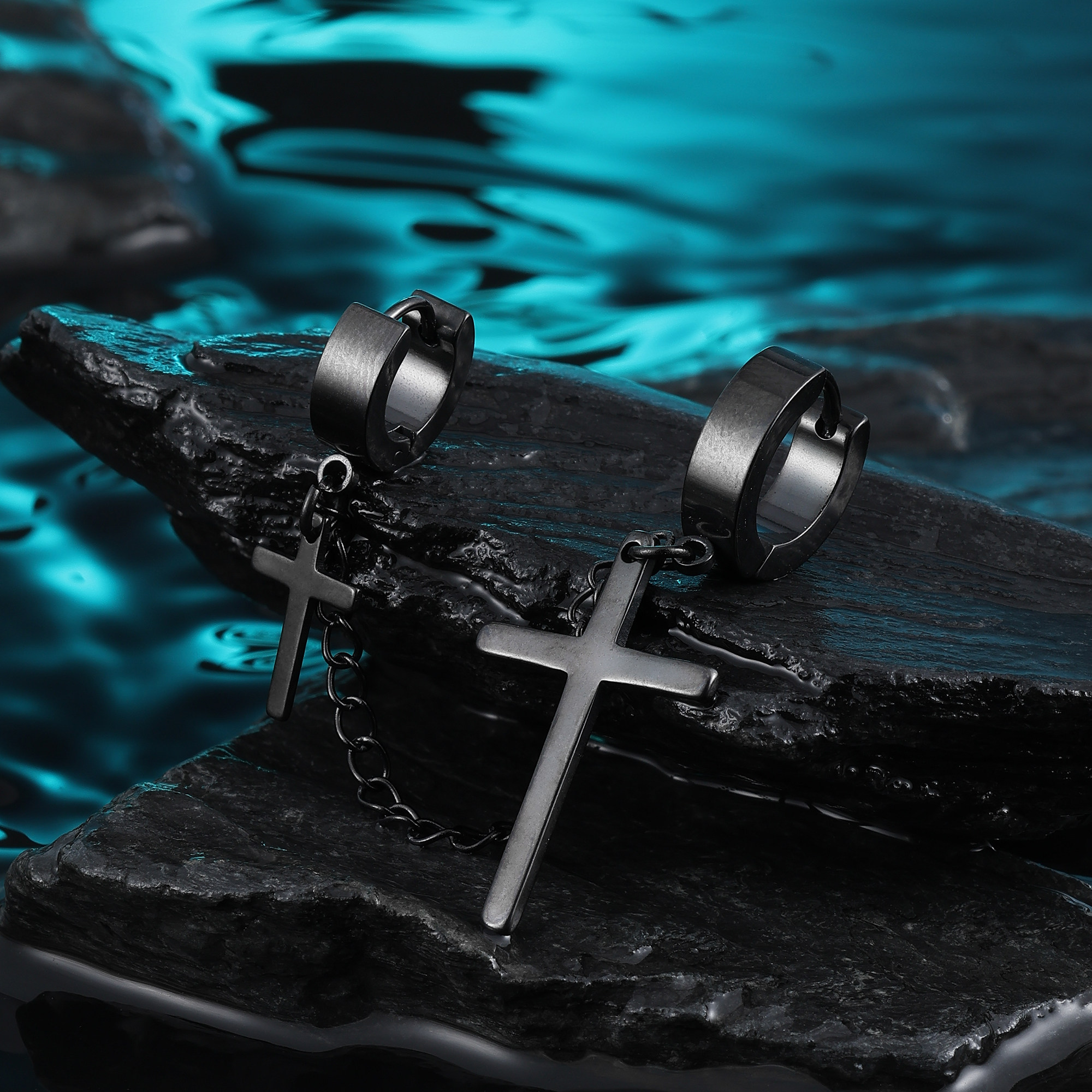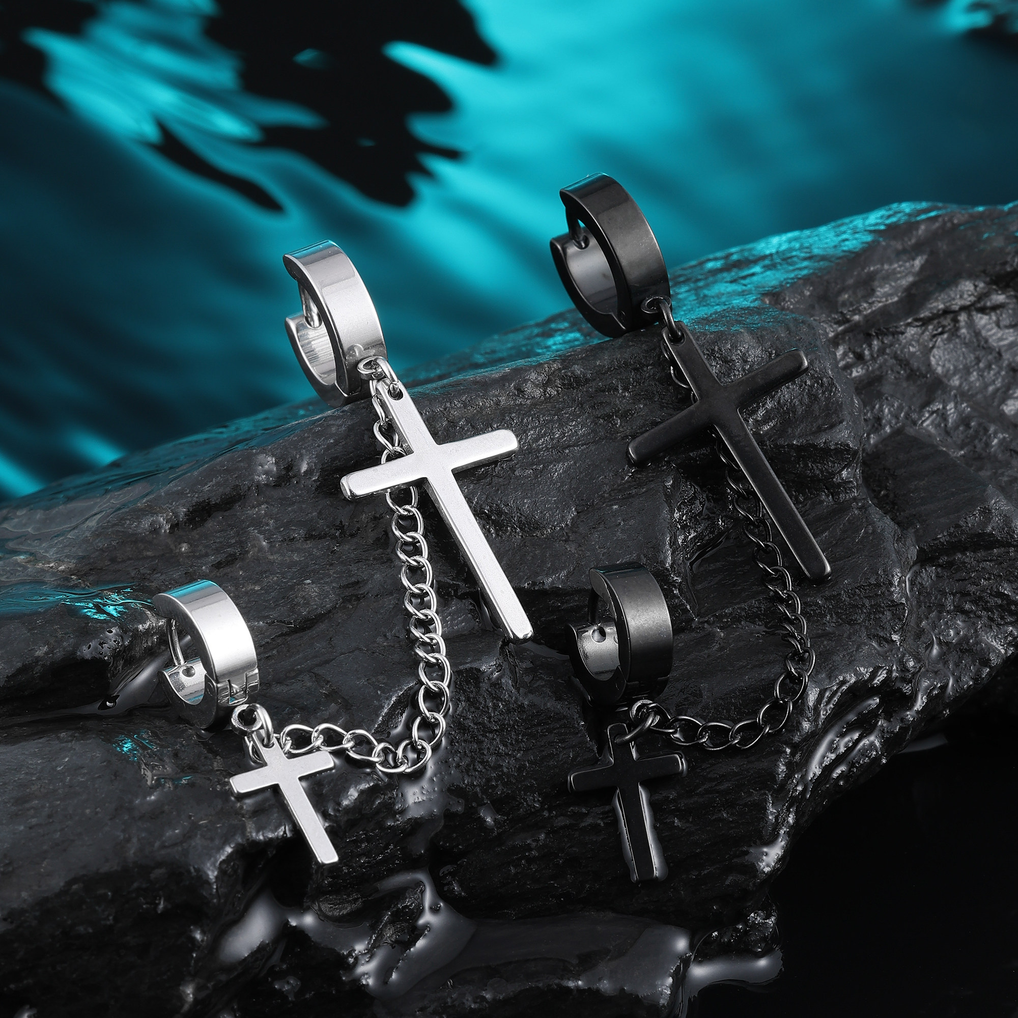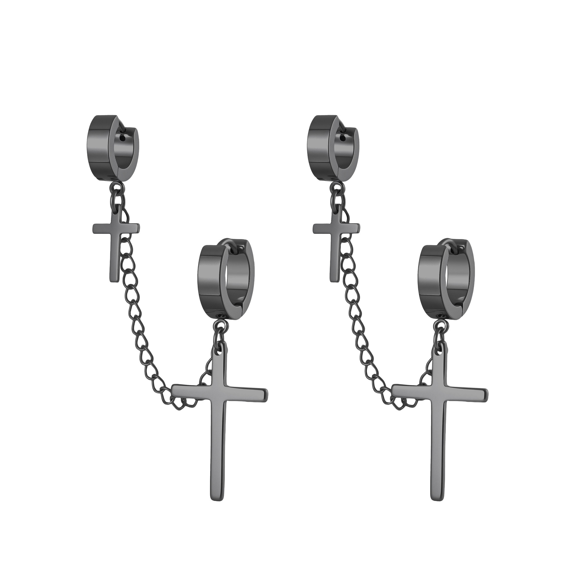 双耳洞十字架流苏耳环男款黑色链条耳钉耳骨钉钛钢耳扣耳圈耳饰女