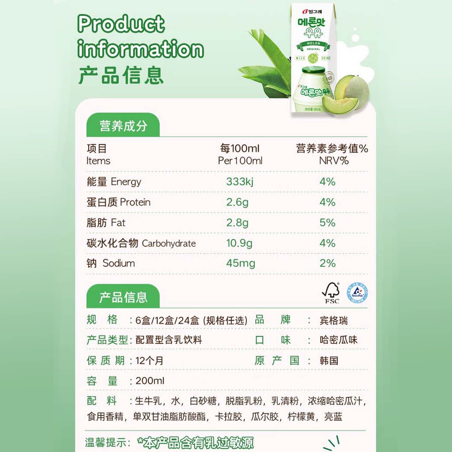 宾格瑞哈密瓜味牛奶200ml